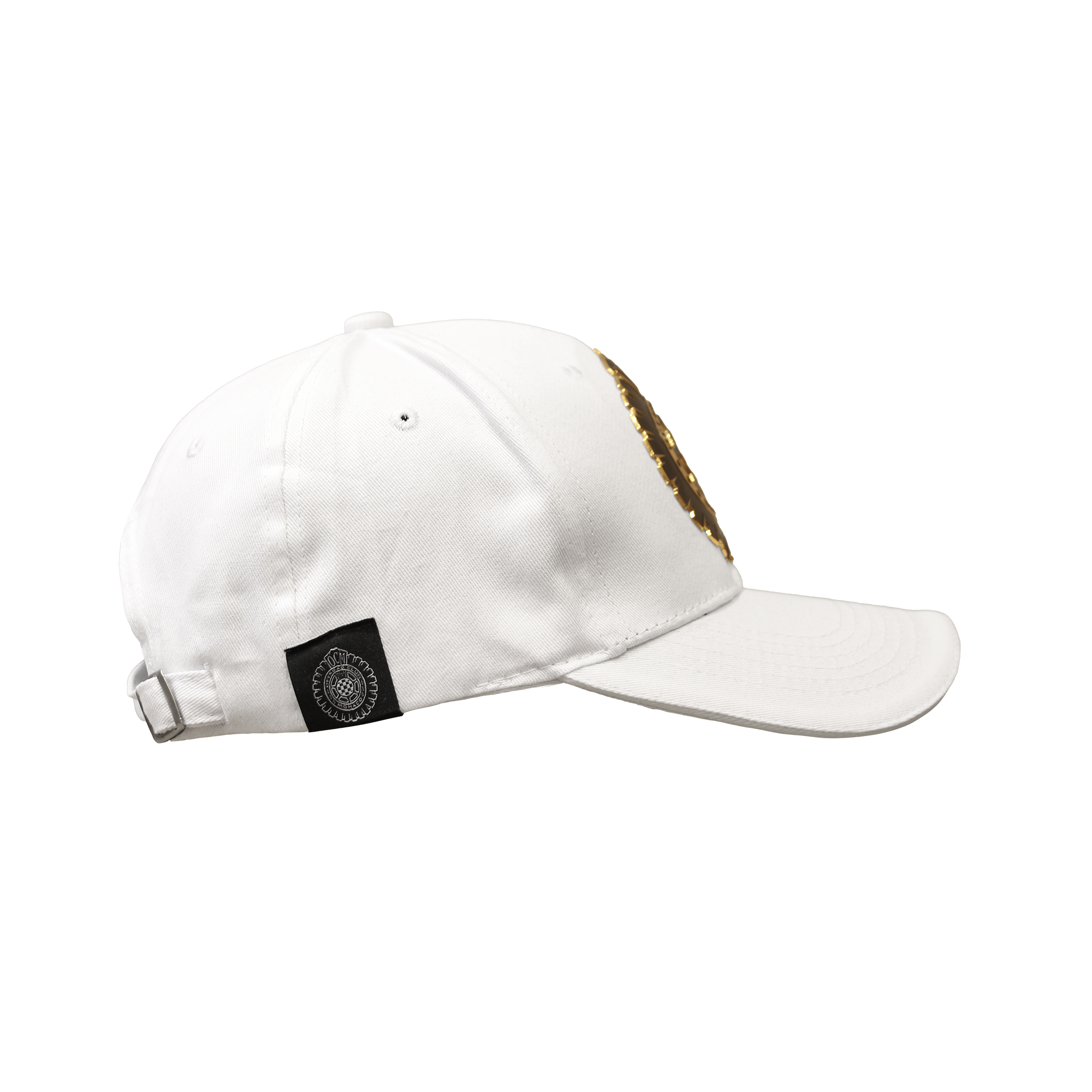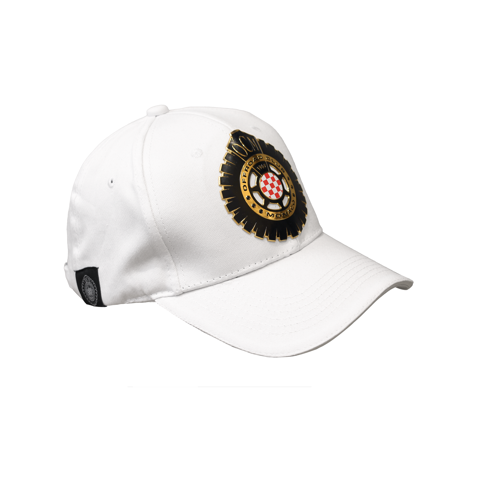 Elegante cappellino in cotone con visiera, chiusura regolabile e sgancio rapido con bottone automatico di sicurezza, ideale per grandi e piccini. Arricchito di cuciture decorative, etichetta laterale personalizzata in jacquard, applicata a cavallotto e sofisticato patch in TPU dallo scenico effetto metallico dell’oro in rilievo e stampato caldo.