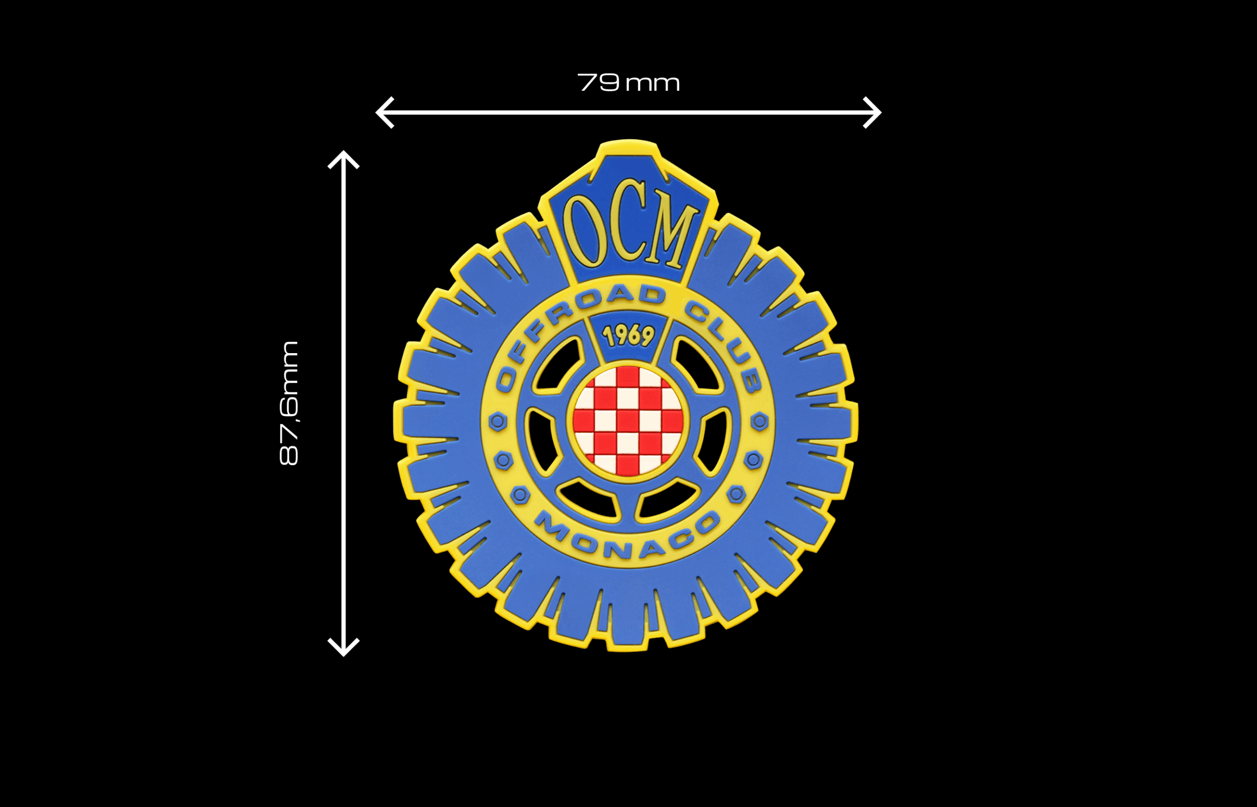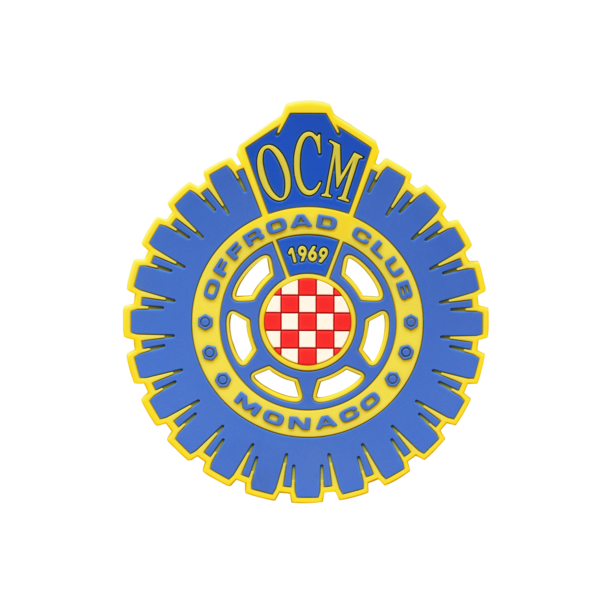 Grintoso patch in gomma del logo Offroad Club Monaco, in vivaci colori fluo: blue royal, giallo, rosso e bianco.