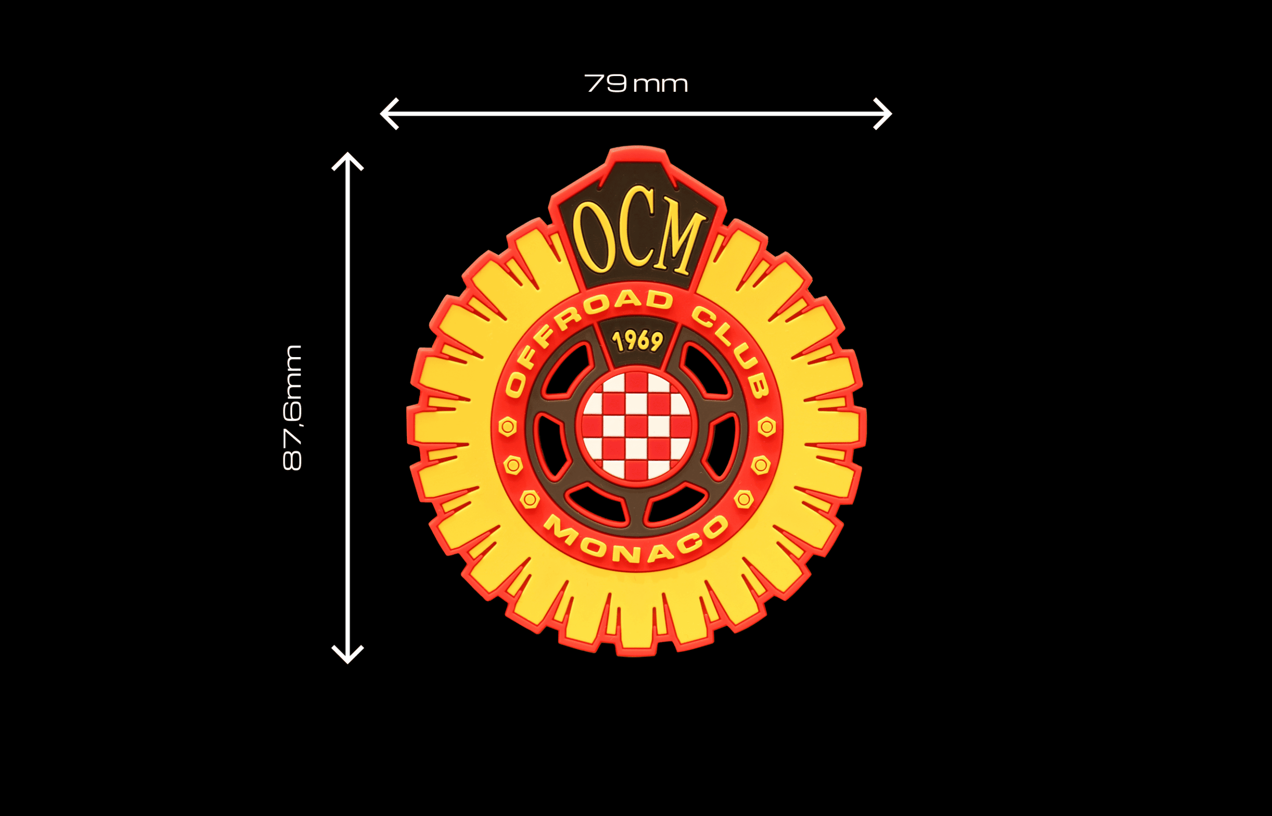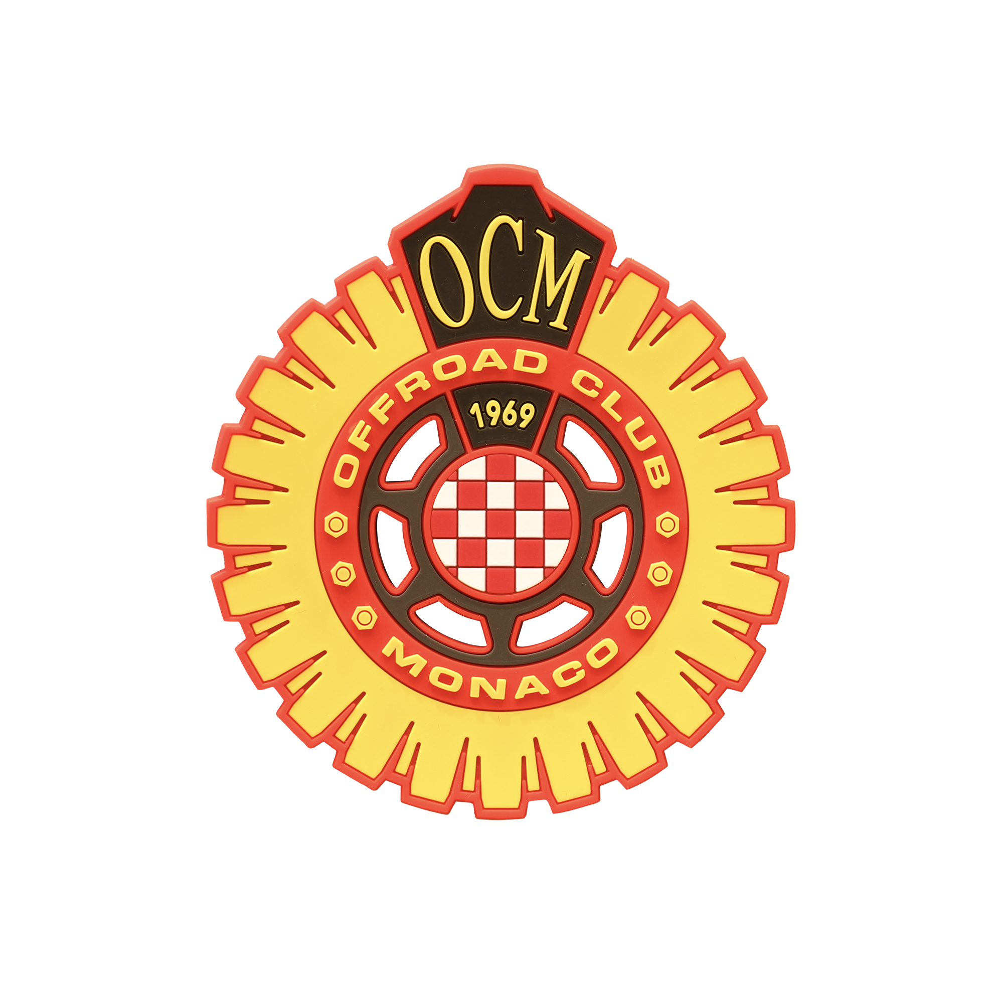 Grintoso patch in gomma del logo Offroad Club Monaco, in vivaci colori fluo giallo, rosso, nero e bianco.