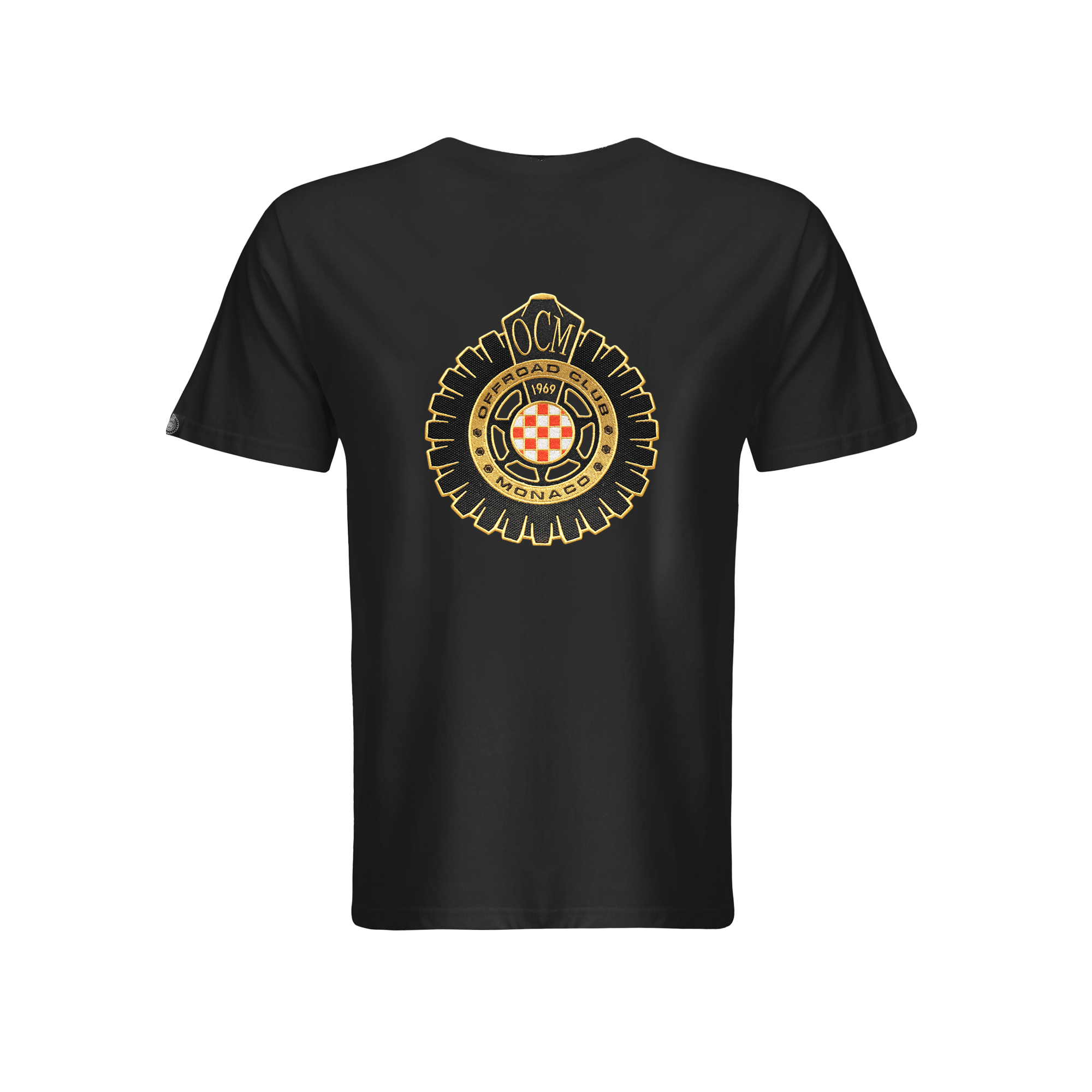 Maglietta in cotone pettinato nera, impreziosita da etichetta jacquard cucita a cavallotto nella manica sinistra, con l’applicazione del nostro iconico logo ricamato in raffinato filo dorato come stemma sul lato cuore e sul retro da un altro prezioso logo di dimensione maggiore, apposti entrambi a mano tramite pressa.