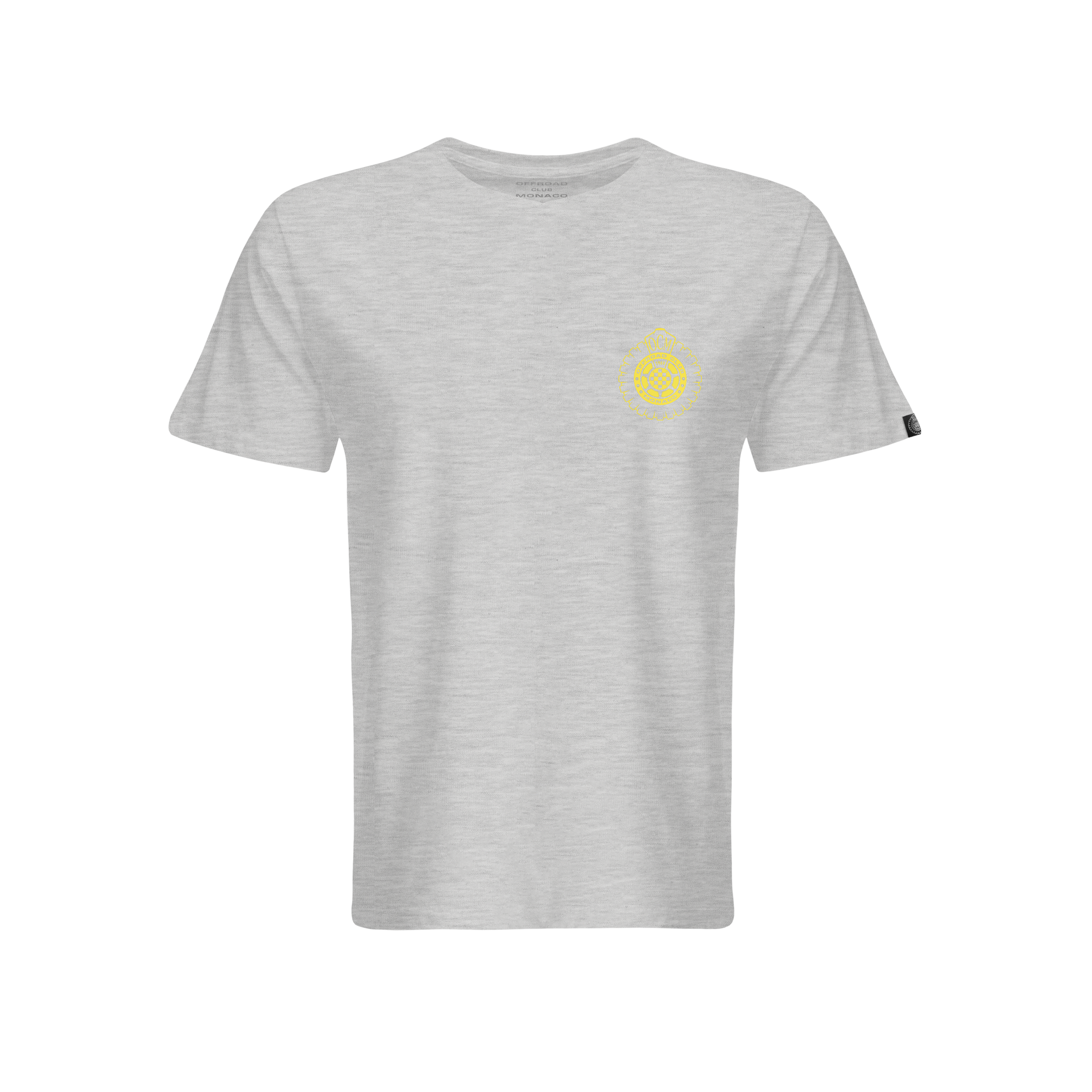 T-shirt girocollo a manica corta, in jersey, 100% cotone pettinato e arricchita da etichetta jacquard personalizzata e cucita a cavallotto sulla manica sinistra.