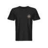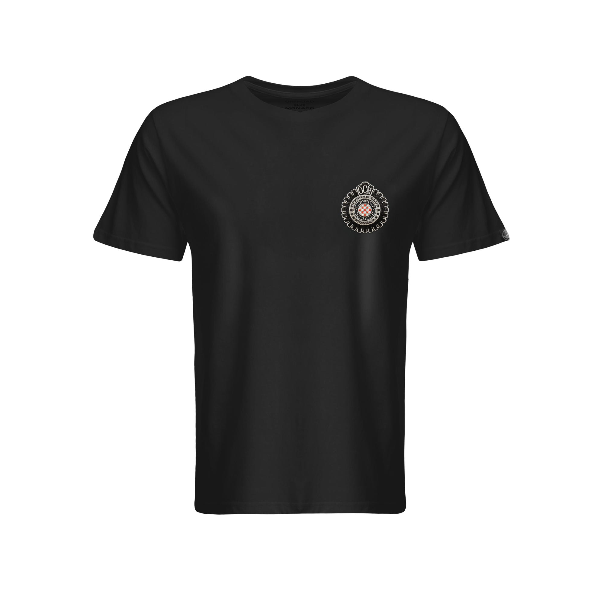 Maglietta in cotone pettinato nera, impreziosita da etichetta jacquard cucita a cavallotto nella manica sinistra, con l’applicazione della rivisitazione del nostro iconico logo ricamato i in prezioso filo argentato, come stemma sul lato cuore e sul retro da un altro prezioso logo di dimensione maggiore, apposti entrambi a mano tramite pressa.