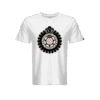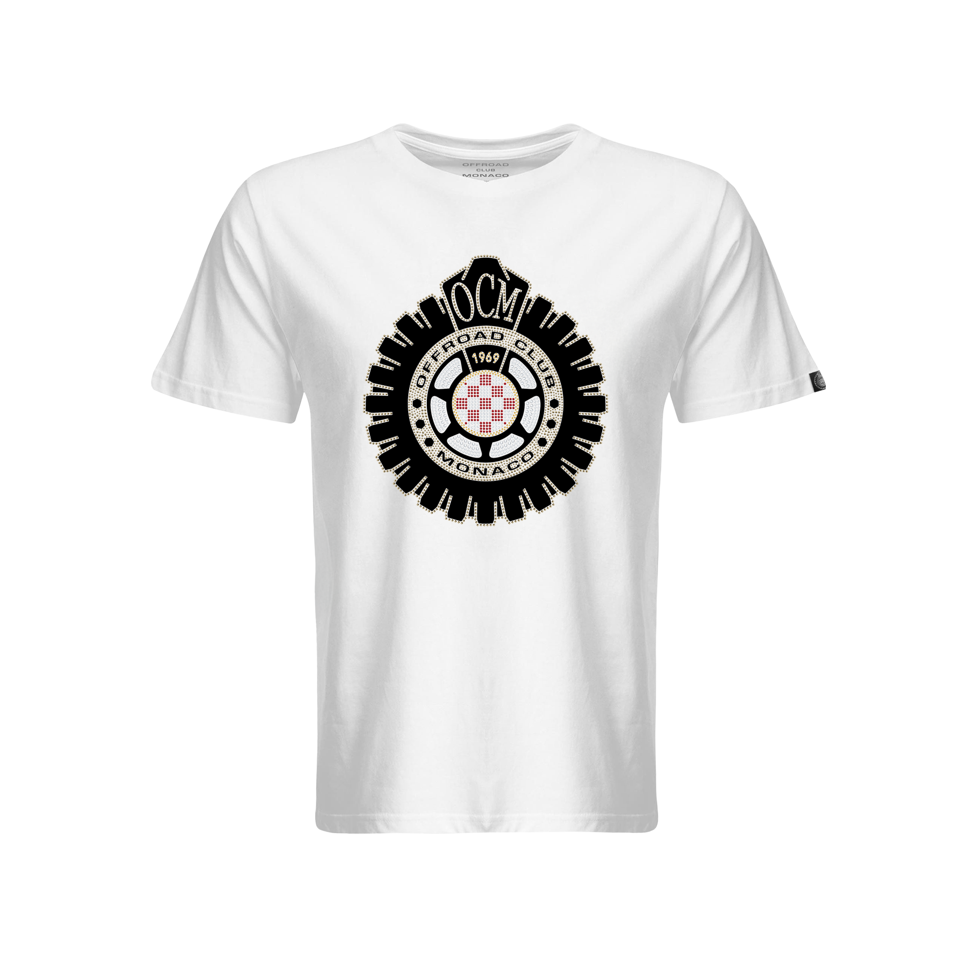 Maglietta in cotone pettinato bianca, impreziosita da etichetta jacquard cucita a cavallotto nella manica sinistra, con esclusivo e iconico logo Offroad Club Monaco in vinile nero, arricchito da bordi e particolari in brillantini applicati a mano tramite pressa sul davanti.