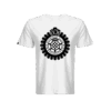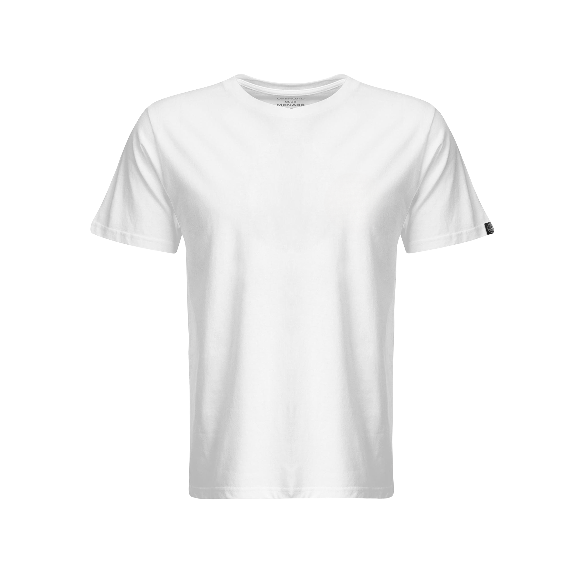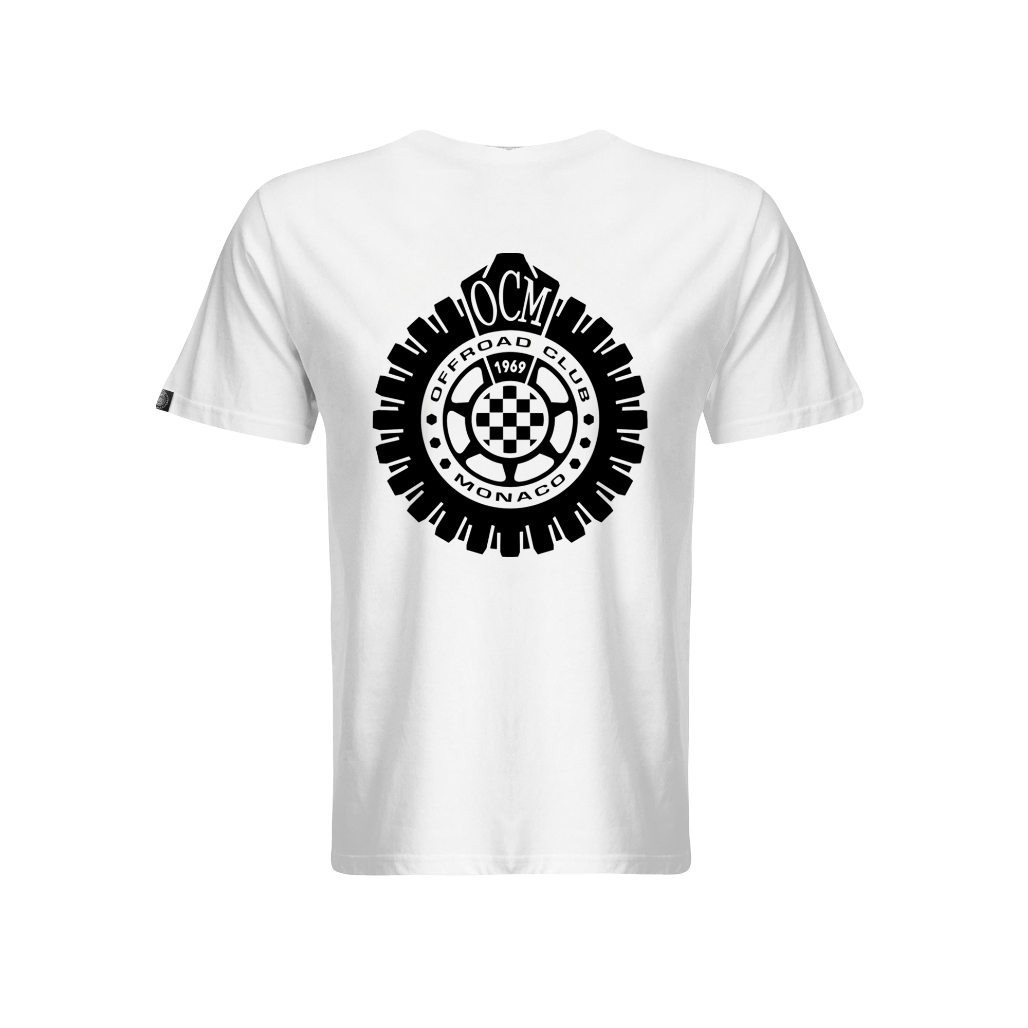 Maglietta in cotone pettinato bianca, impreziosita da etichetta jacquard cucita a cavallotto nella manica sinistra, con esclusiva rivisitazione del logo Offroad Club Monaco in vinile nero, applicato a mano tramite pressa sul retro della t-shirt.