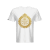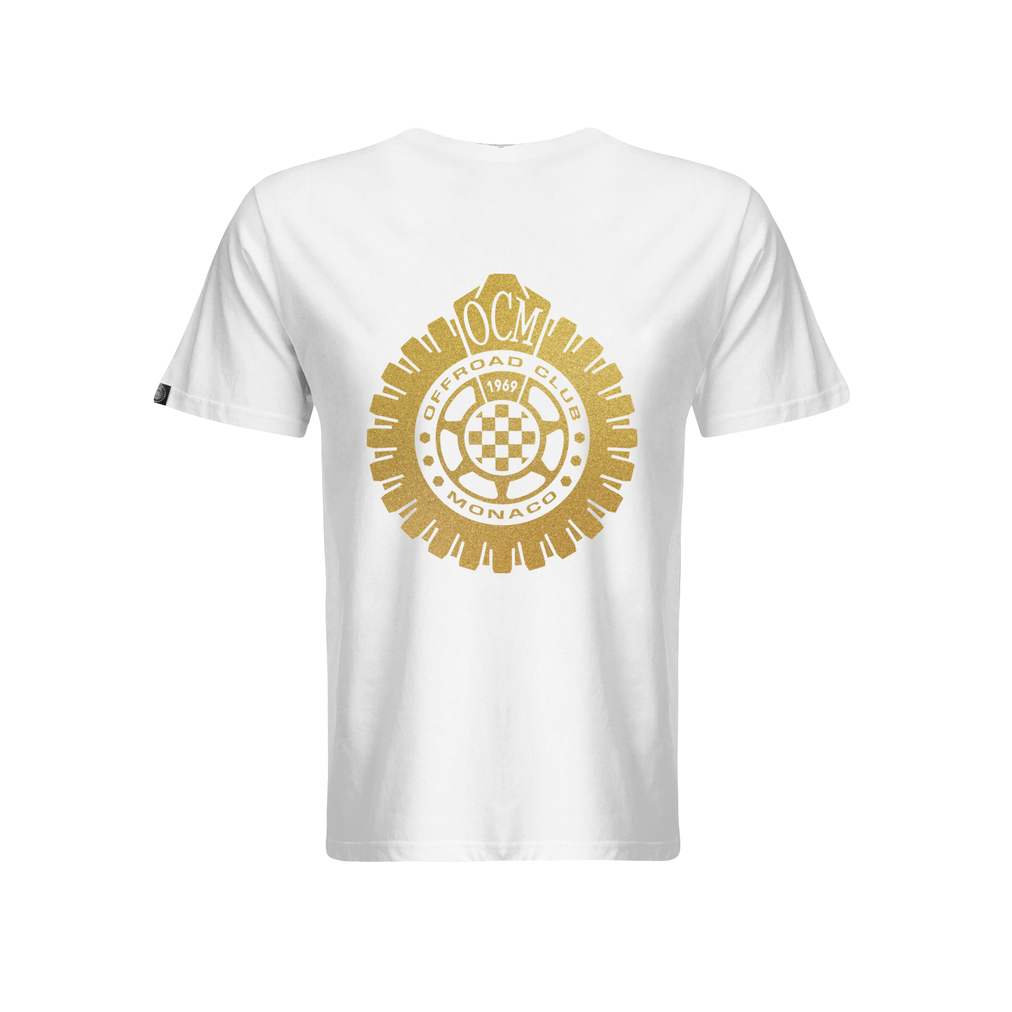 Maglietta in cotone pettinato bianca, impreziosita da etichetta jacquard cucita a cavallotto nella manica sinistra, con esclusiva rivisitazione brillante del nostro logo Offroad Club Monaco in vinile oro metallizzato, applicato a mano tramite pressa sul retro della t-shirt.