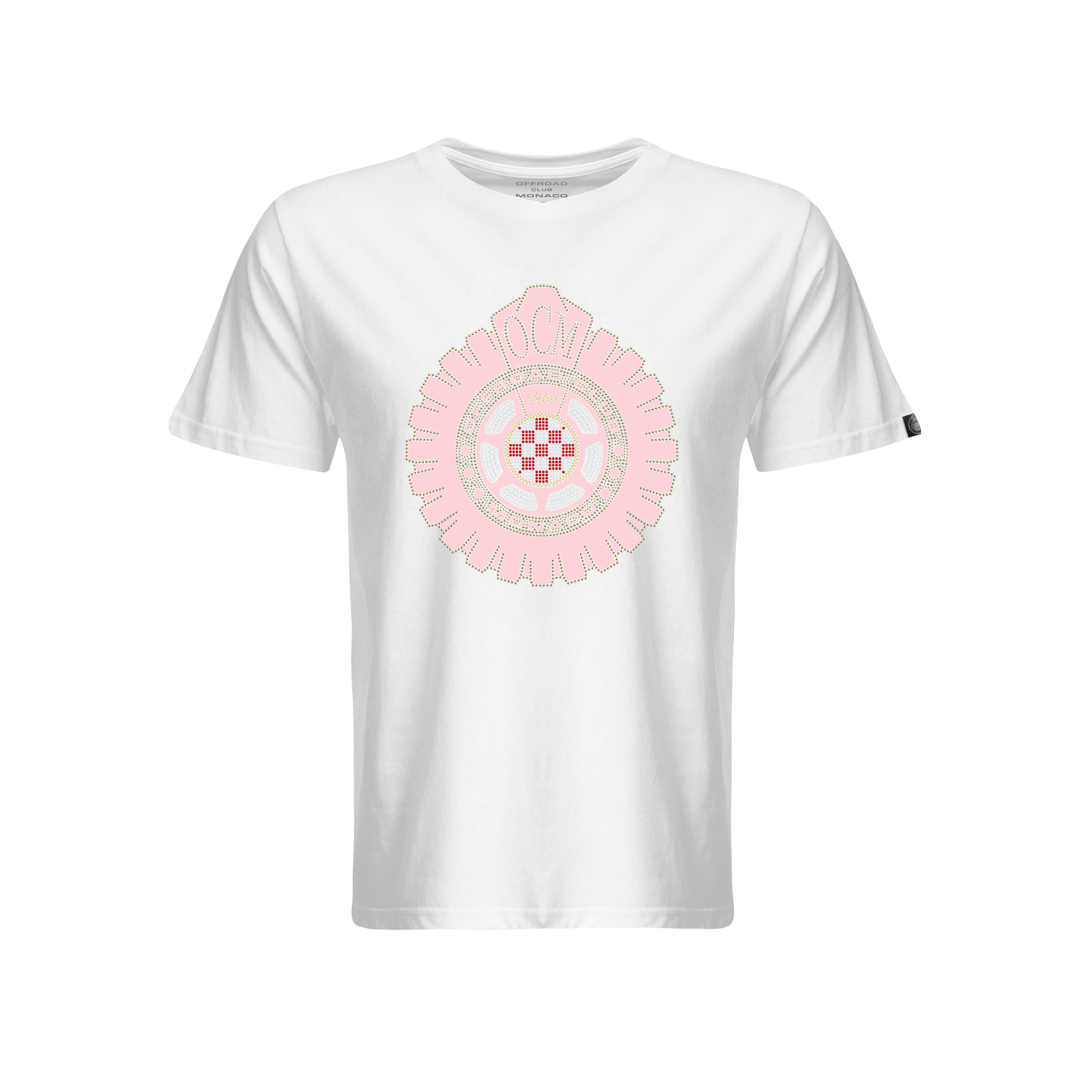 Maglietta in cotone pettinato bianca, impreziosita da etichetta jacquard cucita a cavallotto nella manica sinistra, con rivisitazione del logo Offroad Club Monaco in vinile rosa tendenza, arricchito da bordi e particolari in brillantini applicati a mano tramite pressa sul davanti.