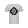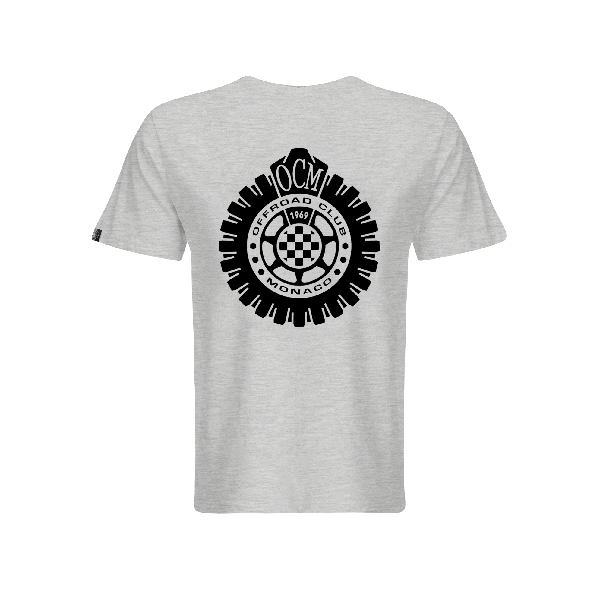 Maglietta in cotone pettinato grigia, impreziosita da etichetta jacquard cucita a cavallotto nella manica sinistra, con esclusiva rivisitazione del nostro logo Offroad Club Monaco in vinile nero, applicato a mano tramite pressa sul retro della t-shirt.
