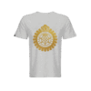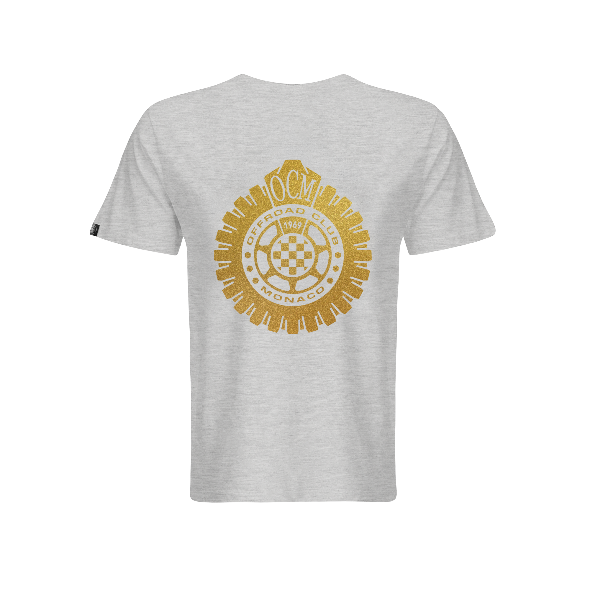 Maglietta in cotone pettinato grigia, impreziosita da etichetta jacquard cucita a cavallotto nella manica sinistra, con esclusiva rivisitazione brillante del nostro logo Offroad Club Monaco in vinile oro metallizzato, applicato a mano tramite pressa sul retro della t-shirt.