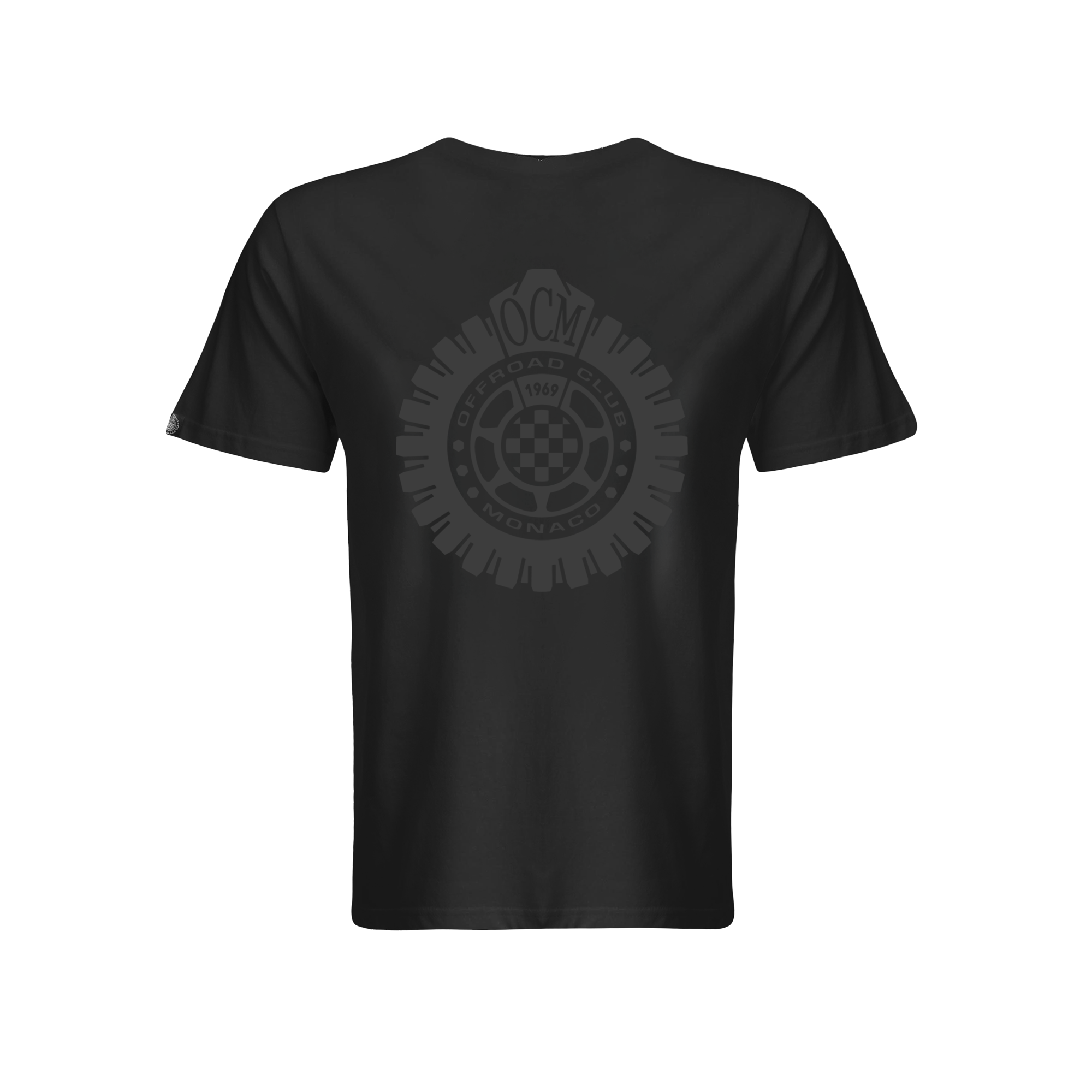 Maglietta in cotone pettinato nera, impreziosita da etichetta jacquard cucita a cavallotto nella manica sinistra, con esclusiva rivisitazione del nostro logo Offroad Club Monaco in vinile nero, applicato a mano tramite pressa sul retro della t-shirt.